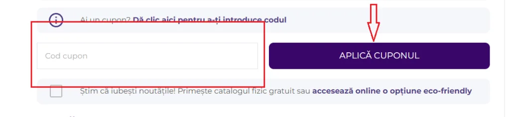 In acel camp, introduci codul pe care il detii, exact asa cum este scris – cu atentie la litere mari, mici si eventuale simboluri. Dupa ce apesi butonul pentru aplicarea codului, reducerea va fi calculata automat si pretul total va fi actualizat imediat. Daca totul este in regula si codul este inca valabil, vei vedea instant reducerea aplicata la comanda ta.