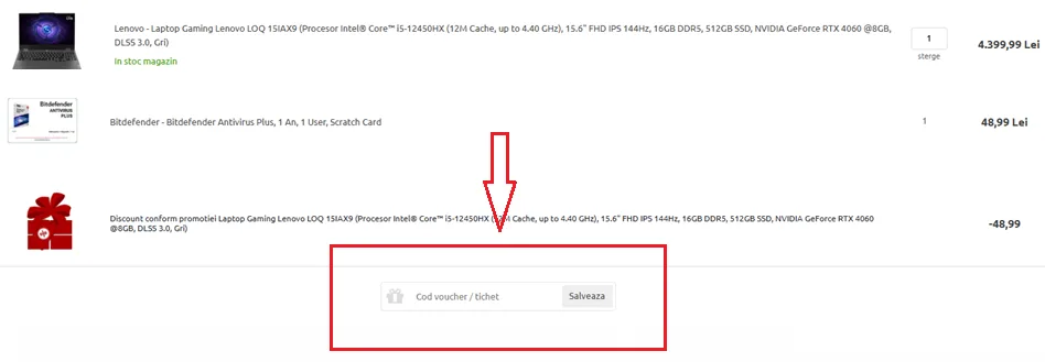 Daca ai introdus totul corect si codul e inca valabil, pretul se va actualiza imediat. Daca apare o eroare, poate fi din cauza ca voucherul a expirat sau nu este valabil pentru produsele din cos. Asa ca asigura-te ca il folosesti corect.