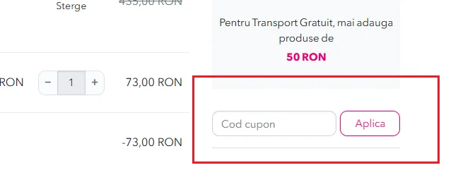 Foarte simplu. Iti alegi produsele preferate, le adaugi in cos si, inainte sa finalizezi comanda, introduci codul de reducere in campul special destinat. Apesi “aplica” si vei vedea imediat noul total actualizat.